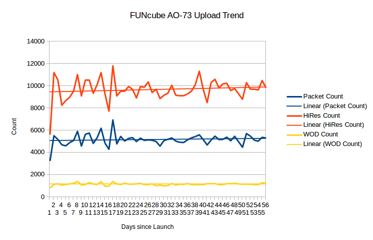 šok73š16.01.2014, 16:00, “Welcome to the FUNcube Web Site” <comment-reply@wordpress.com>: g4dpz posted: “The FUNcube team were interested to know the trend of the number of uploads to the warehouse since launch, we thought we would share our findings: We have been consistently getting more than 5000 raw packets per day and the trend is increasing, tha”