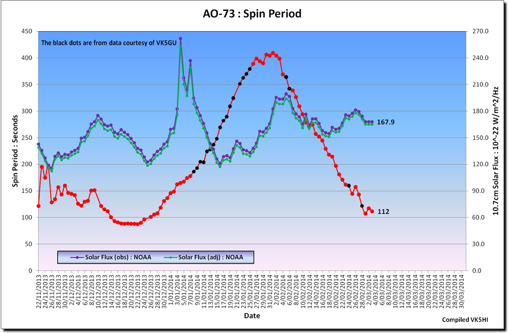 Users in the Northern hemisphere will have noticed that the evening passes in amateur mode are becoming shorter as the spacecraft enters sunlight again near the pole. This effect will increase as the season progresses and we will be testing a plan to change the operating schedule in a few weeks time. This test will involve placing the spacecraft into continuous amateur/transponder mode for a number of orbits – probably over a weekend.