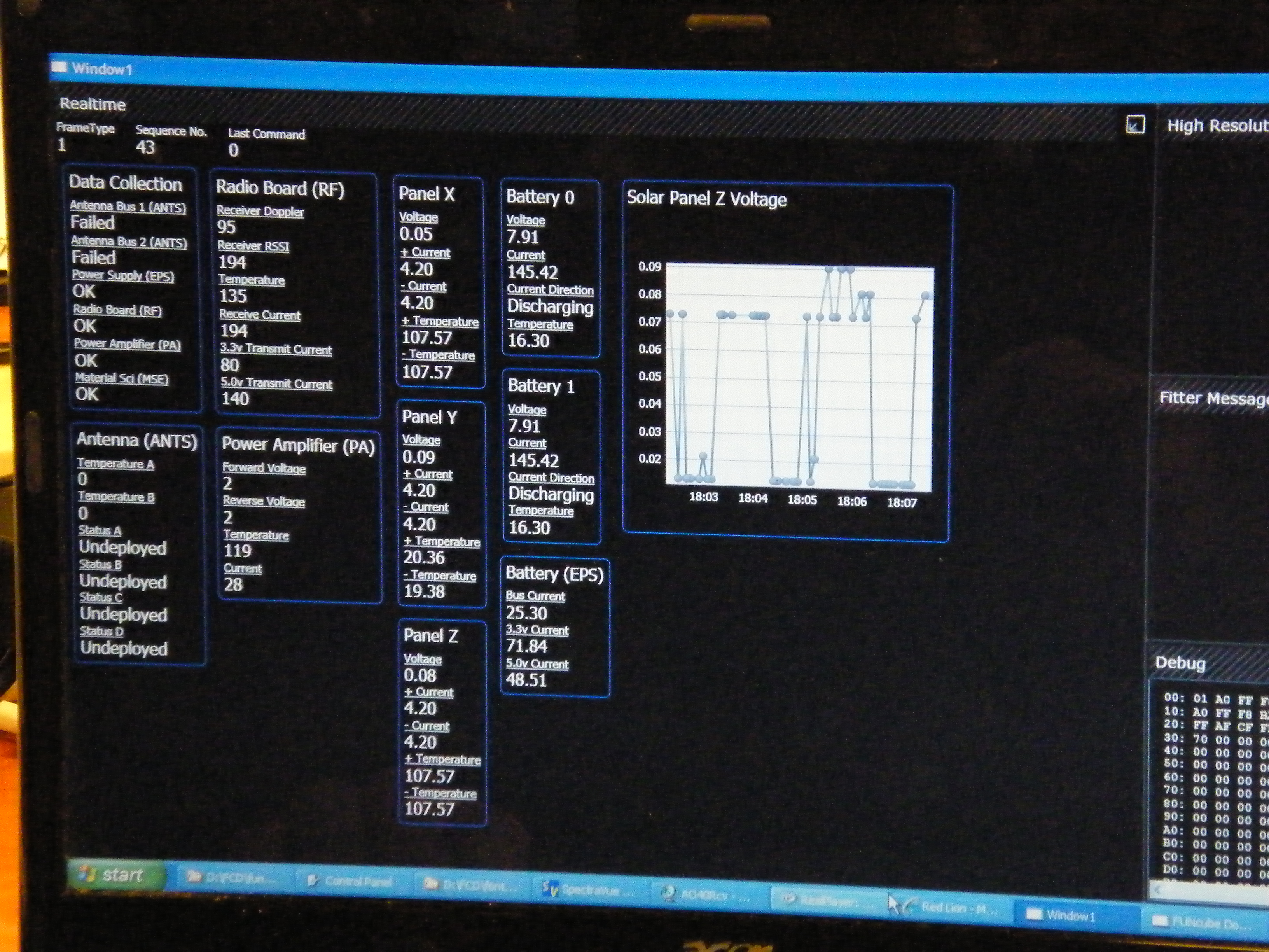 The other ‘new’ item was what has become known at the “Engineering GUI”. This has been written by a member of the software team, and is intended to be a simple, no frills, way of displaying the various telemetry channels. Currently this only runs on Windows, and is not yet complete. It has four display panes, one each for raw (Hexadecimal) tlm display, one for Realtime tlm, one for WOD, and one for ‘FAST’ tlm. So far only the software for the Real Time and RAW panes has been written. Nonetheless, it was an extremely useful tool for us to monitor what was happening inside the ‘stack’. During the weekend it was running on a laptop, to which was connected a FUNcube dongle.