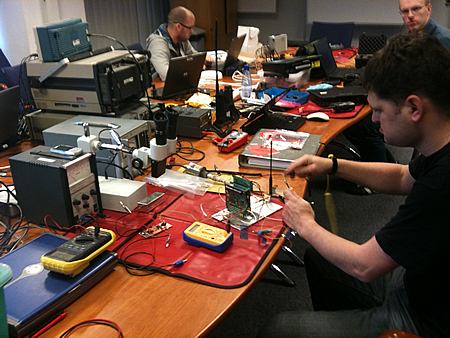 Below are some pictures and video of the meeting The aim was to build a ‘stack’ of the various boards which will make up FUNcube, and see if they worked! In particular we wanted to prove to ourselves that we could command the satellite remotely via RF, and look at the telemetry from the stack remotely using the FUNcube dongle. We also wanted to do things like show that we could command the antennas to deploy, as well as changing the mode of the satellite from one mode to another, eg from transponder mode to education mode, and back again.
